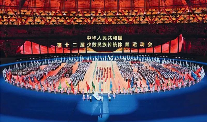 2024年11月22日,中華人民共和國(guó)第十二屆少數(shù)民族傳統(tǒng)體育運(yùn)動(dòng)會(huì)開幕式在海南省三亞市舉行,56個(gè)民族歡聚一堂,共同奏響中華民族一家親、同心共筑中國(guó)夢(mèng)的華美樂(lè)章。圖為開幕式現(xiàn)場(chǎng)。 新華社記者 郭程/攝
